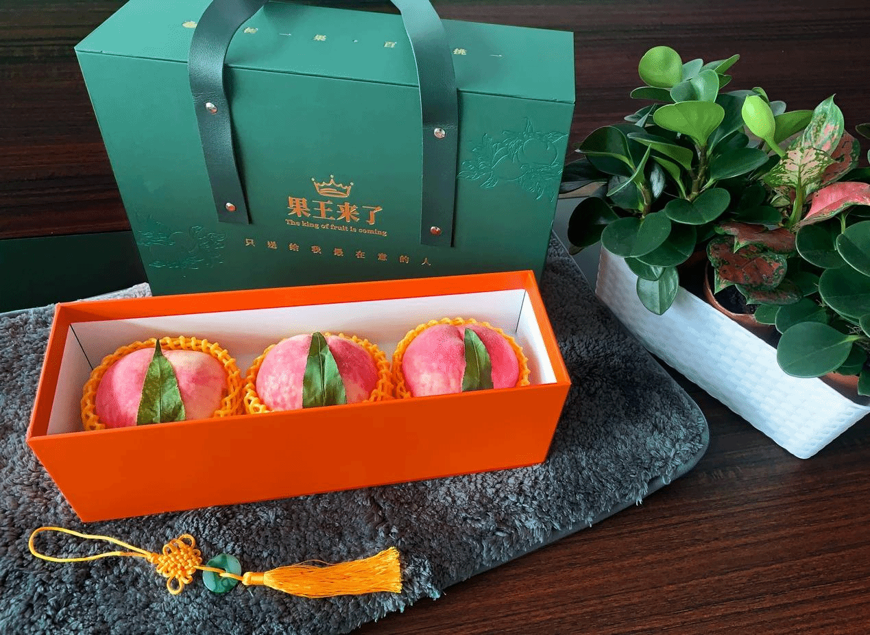 中国人对于桃的审美意趣源远流长,花色妍丽,果称佳品,桃子自古便被赋予长寿、吉祥与甜蜜的美好寓意。凭借着对这一文化瑰宝的深刻理解与敬意,以生产端所精心遴选的优质桃子为基石,何辉团队匠心独运地打造出一款别出心裁的桃子礼盒——“果王来了”。
