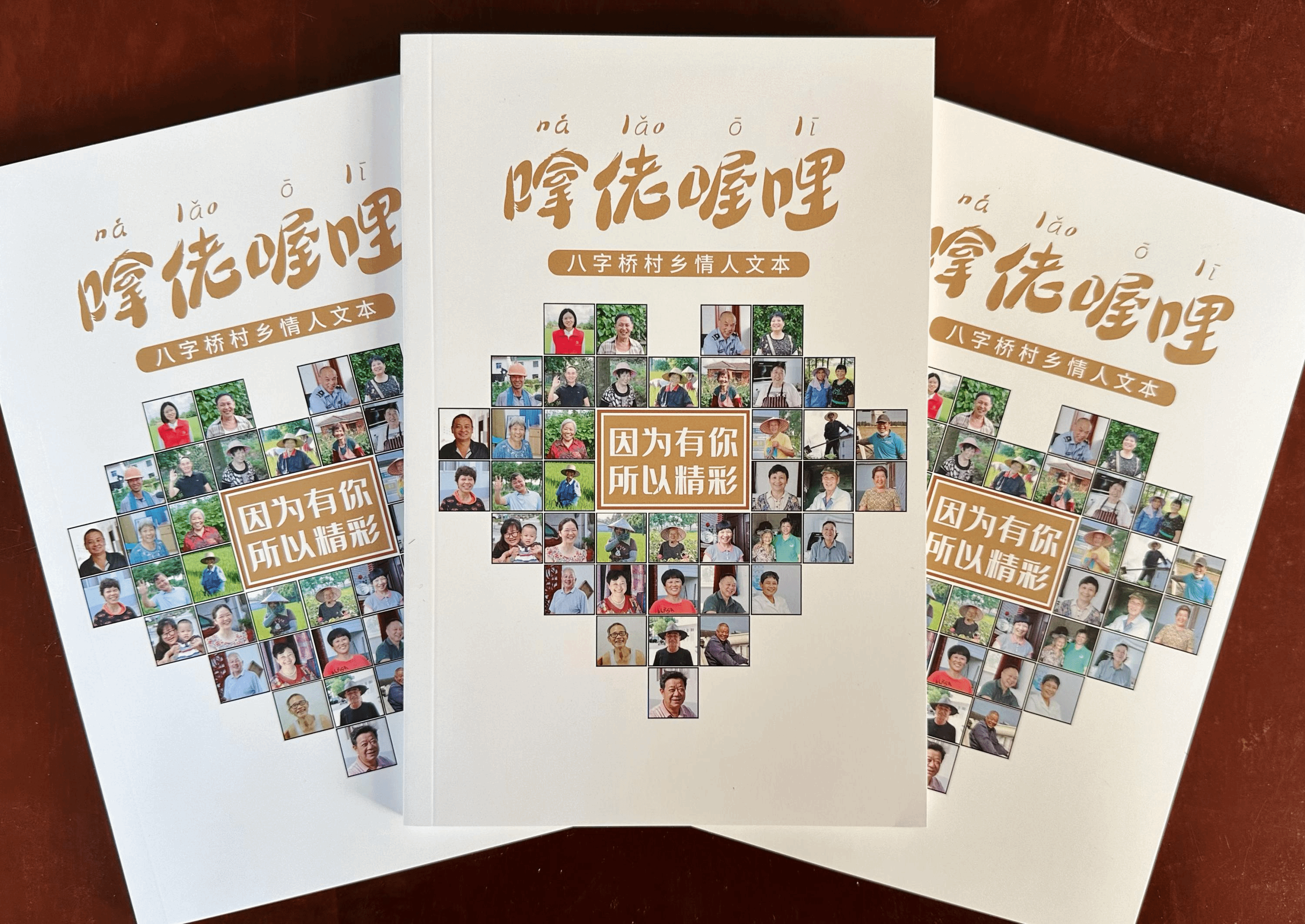 与此同时,邱喆倩为村民设计制作了八字桥村乡情人文本,希望让村民从中了解到翔实的乡情概况,寻找到匠心的文化传承,获取到最全的便民联系信息。有一位老伯给她留下深刻印象,他捧起小册子仔细地读着每一页,感慨地跟邱喆倩说道,自己曾在社区图书馆借阅过镇志,内心始终渴望着能拥有一本可以买回家永久珍藏的、关于家乡的书籍。“现在有一本全村老百姓都能拿到、专属我们村的乡情人文本真是太好了!”邱喆倩把这本小册子的主题定为“嗱佬喔哩”,这句充满乡土气息的本地土话意为“我们的老家”,而她也将这里视为自己的老家。这里的每一寸土地、每一位村民都与她的心灵紧密相连。她希望村民捧起“嗱佬喔哩”就能够“望得见田野、看得见河流、记得住乡愁”。