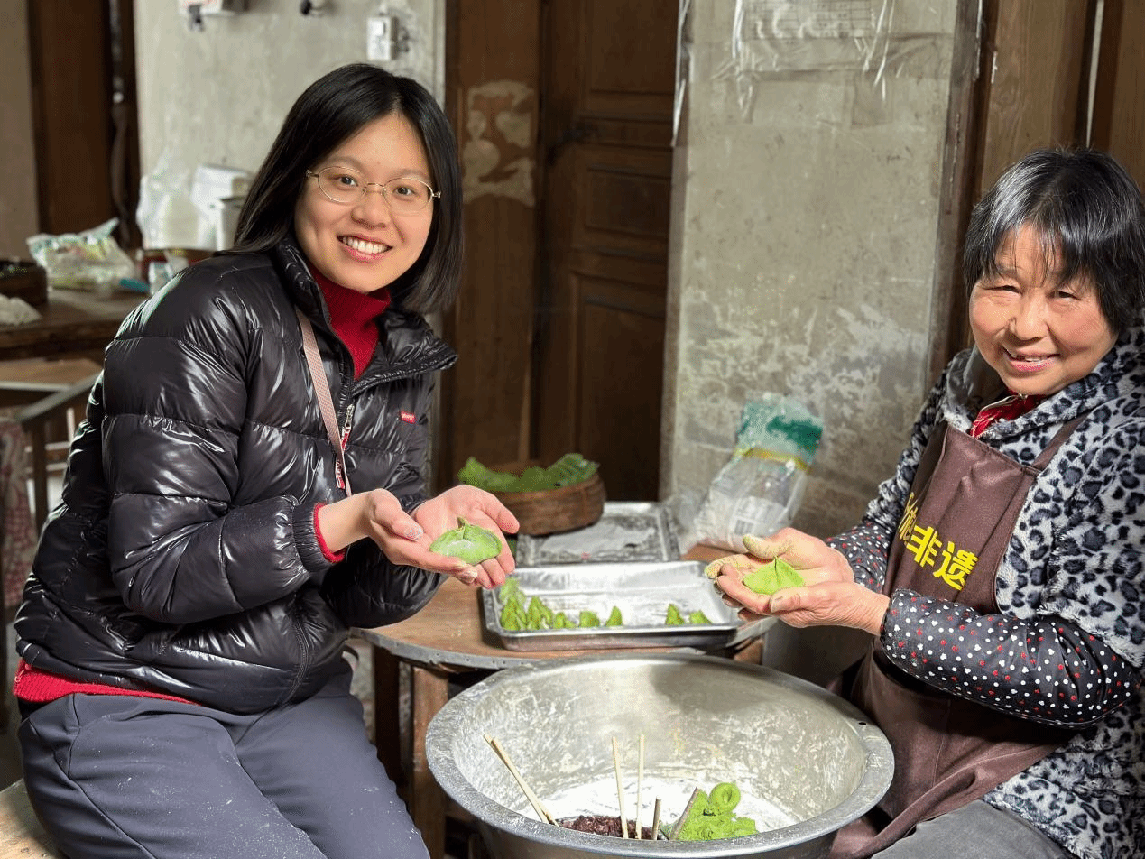 恰逢清明时节,邱喆倩从“舌尖上的非遗”入手,一家家入户走访,挖掘收集最原汁原味的第一手资料。八字桥村有两位年过七旬的阿婆,她们用了大半辈子的时光,守护着制作青龙饺的传统手艺。从“为什么开始学”说起,邱喆倩和阿婆们聊到了她们小时候制作青龙饺的趣事,聊到了制作的具体流程,也聊到了她们对这项非遗手艺传承的憧憬。热情的阿婆们带她去河边采摘新鲜的青草,回家亲手舂成汁;手把手带着她揉面团,教她做出一只只元宝状的青龙饺。体验式的采访,让邱喆倩从指尖的触感、耳畔的话语中深入了解到村里老手艺人的内心世界,感受到了非遗文化的温度与厚重。