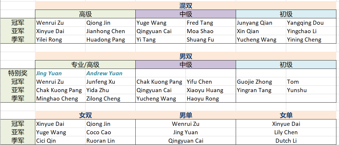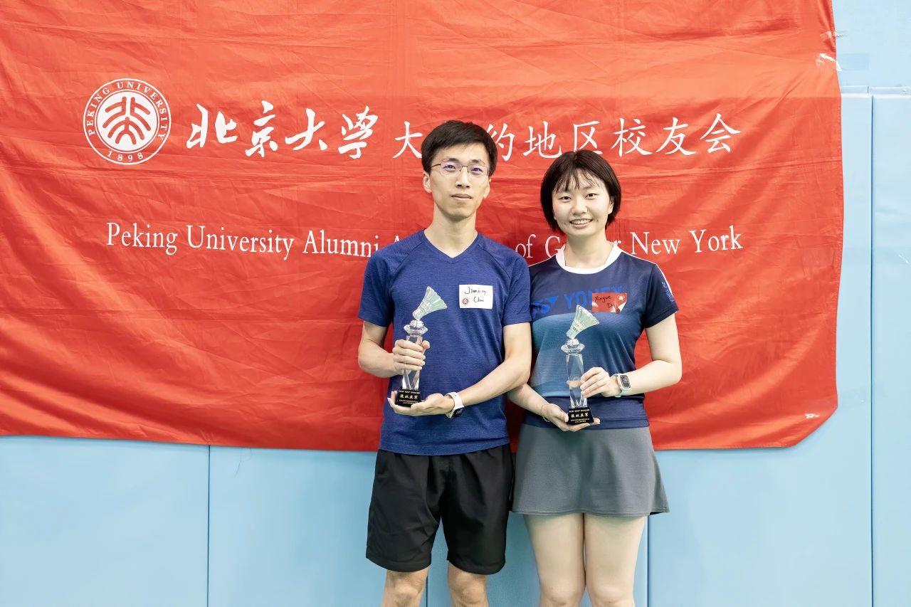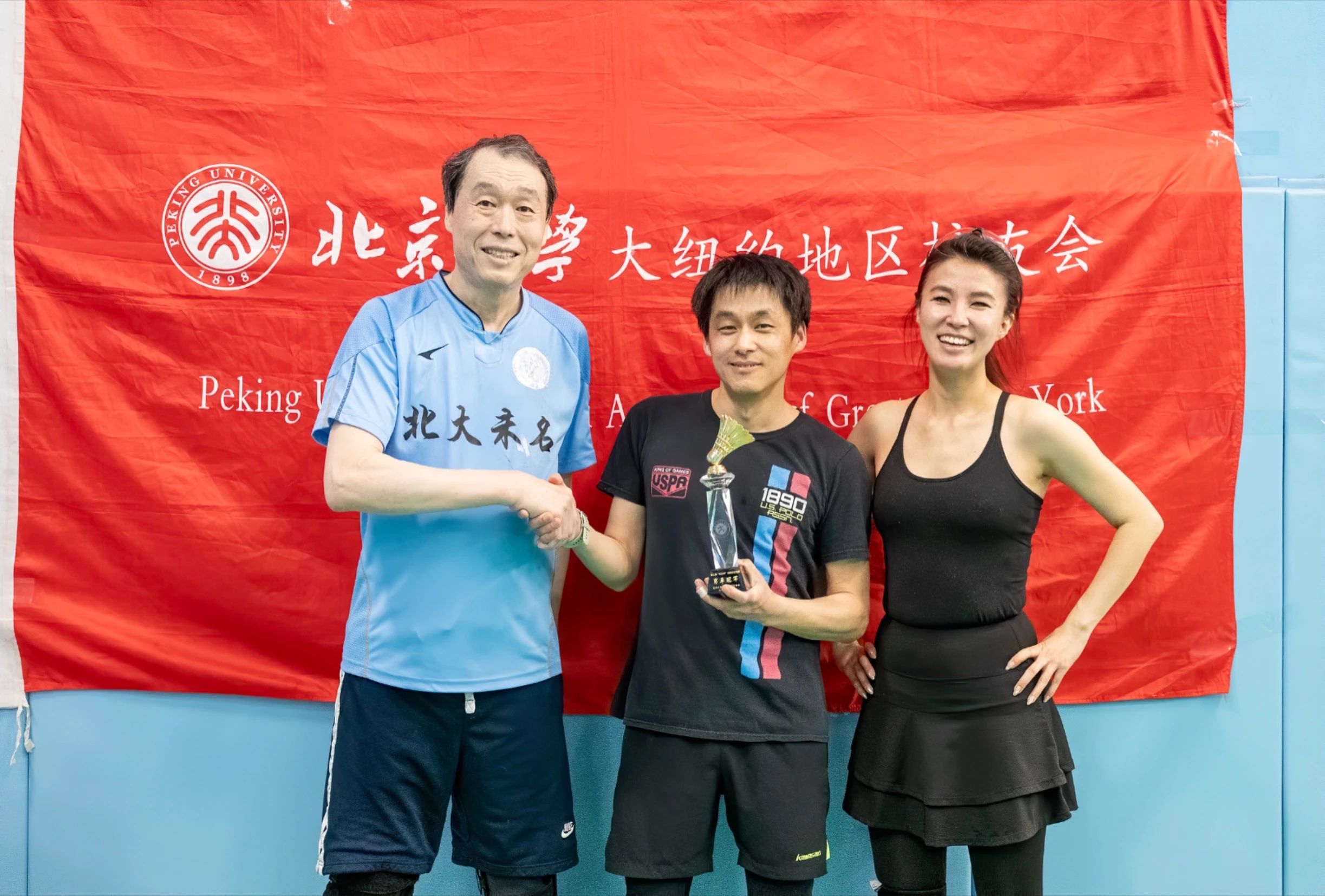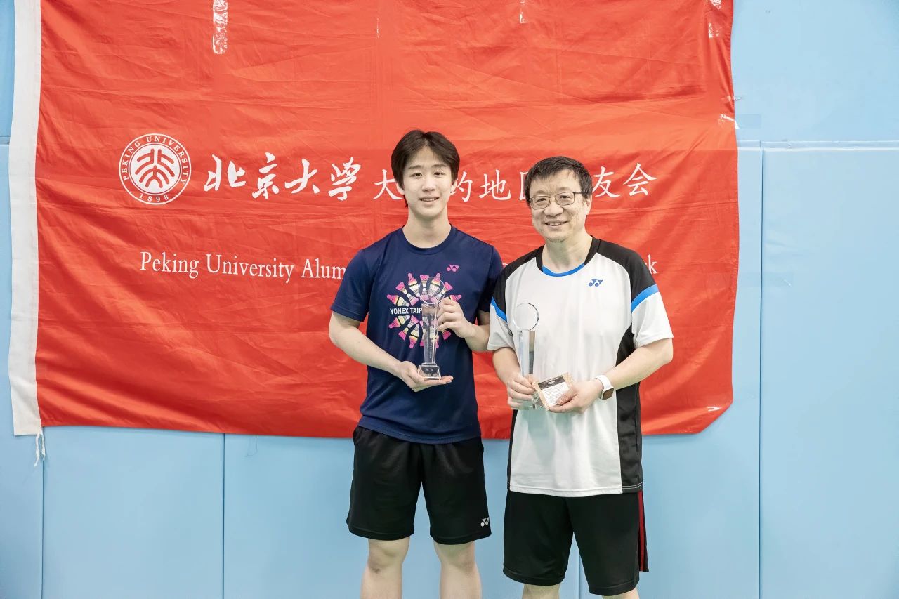 经过近8个小时的激烈角逐,祖文锐(考古系校友)和戴昕悦(数院校友)分别斩获男女单打冠军。两人还分别与金琼搭档,包揽混双和女双冠军,男双冠军则由祖文锐和搭档Junfeng Xu获得。值得一提的是,化院校友袁京再度携子Andrew Yuan出赛,获得男双特别奖,袁京本人也摘得男单亚军,成为赛场上的一段佳话。