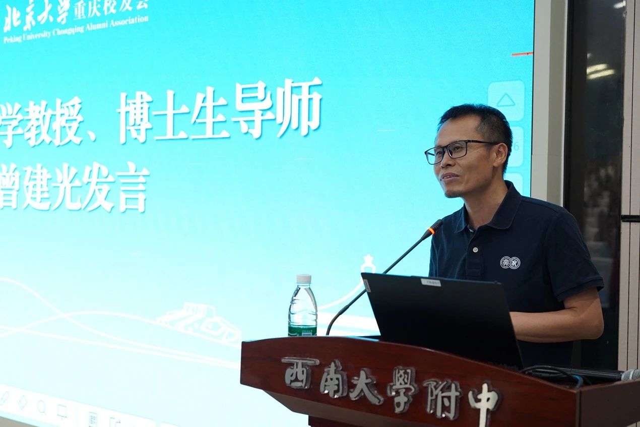 在渝老校友分享奋斗心得。重庆大学教授曾建光以《周易》智慧赠言:“北大人最大的特权是允许自己失败,且败得比别人更体面;重庆的坡坡坎坎专治书斋‘扁平足’;实在撑不住,去坐一次长江索道,看两岸灯火晃成一条虚线,你就会明白,再直的直线,在时间里也会弯成波浪。”