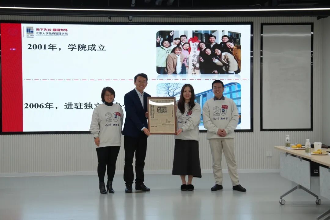 在充满仪式感的捐赠环节,2001级院友代表向学院赠送了一份珍贵的礼物——2001年12月头版报道学院建院的《光明日报》。这份厚重的礼物,不仅承载着院友们对学院的深情,也象征着院友与学院之间血脉相连、共同成长的历史印记。