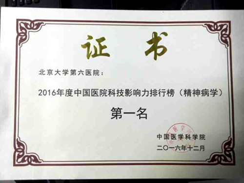 2016年度中国医院科技影响力排行榜发布 北京大学第六医院蝉联精神病学学科第一