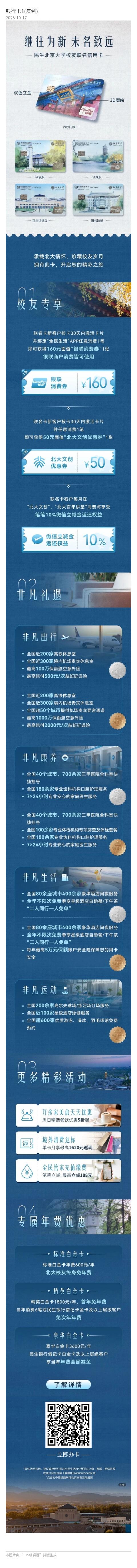 2025年7月,北京大学校友会联合民生银行发布“民生北京大学校友联名信用卡”。该信用卡以“燕园风景”为设计元素,推出了北大西门、华表、塔湖、百周年纪念讲堂、图书馆等5款卡面,同时为北大校友提供了丰富的使用权益。这张联名卡不仅是校友们行走天下的“燕园名片”,也是北大校友会、民生银行回馈北大、服务校友的真挚心意!