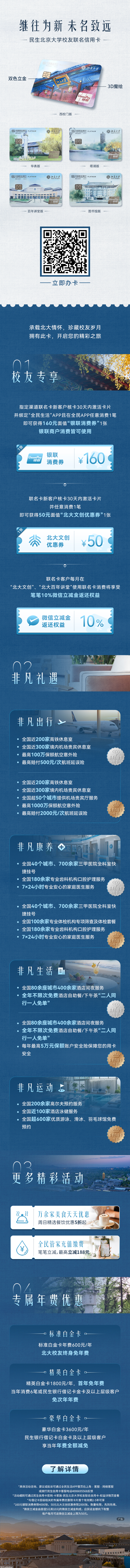 2025年7月,北京大学校友会联合民生银行发布“民生北京大学校友联名信用卡”。信用卡以“燕园风景”为设计元素,推出了北大西门、华表、塔湖、百周年纪念讲堂、图书馆等5款卡面,同时为北大校友提供了丰富的使用权益。这张联名卡不仅是校友们行走天下的“燕园名片”,也是北大校友会、民生银行回馈北大、服务校友的真挚心意!