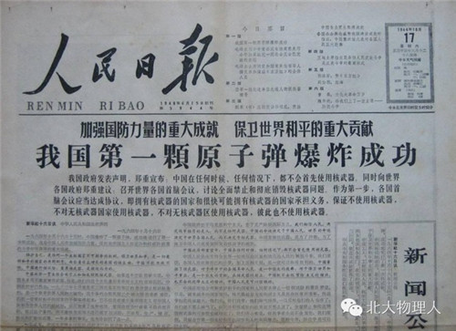 1964年10月16日,中国第一颗原子弹在新疆罗布泊试验基地爆炸成功。北京大学物理系一大批校友参与了我国的两弹事业,其中郭永怀、彭桓武、陈芳允、邓稼先、朱光亚、于敏、周光召七位先生被授予“两弹一星”功勋奖章。 ...