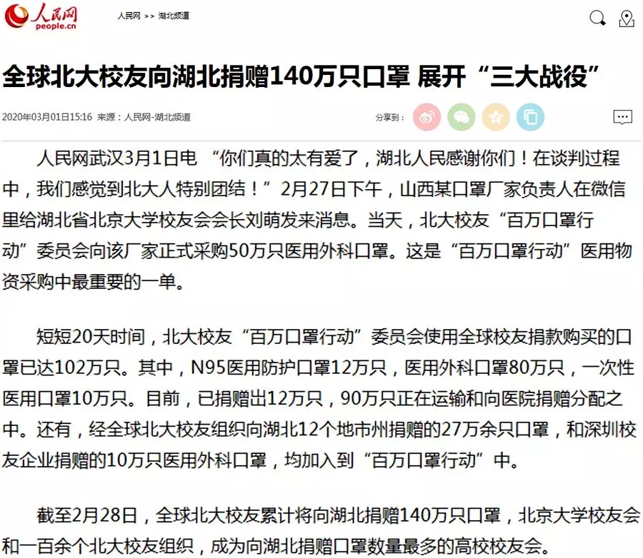 北大人募捐口罩也是专业的 | 武汉大学校友向北大校友“百万口罩行动”捐款自2020年1月25日以来,湖北省北京大学校友会已代收近3万名校友和北大之友的捐款近1000万元。特别是2月8日北京大学校友会发起全球校友“百万口罩行动”后,行动委员会、北大海内外各校友组织、校友个人已采购和即将向... 共同战“疫”,全球北大校友一直在行动! 2020.03.02